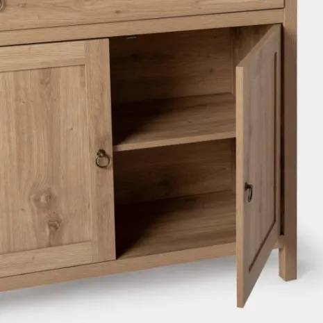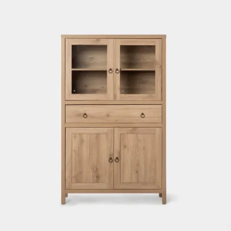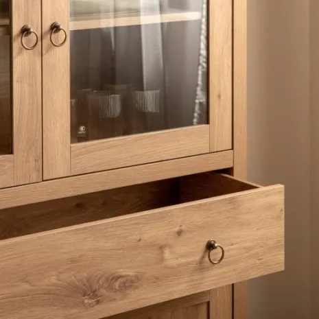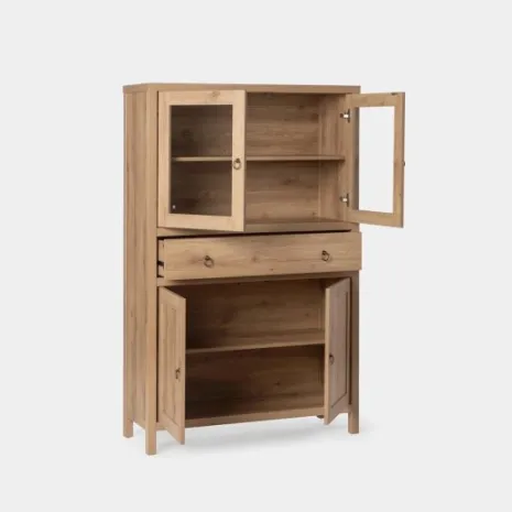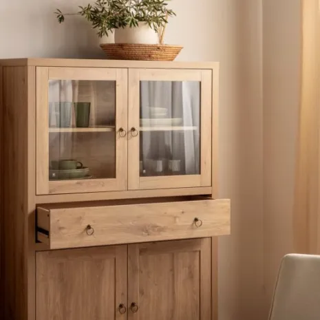 Añade un toque de calidez y estilo a cualquier espacio con la vitrina en madera color natural Livorno. Cuenta con dos amplias puertas acristaladas en las que podrás exhibir tu mejor vajilla, y con dos puertas y un cajón que ofrecen espacio de almacenamiento discreto para todo aquello que prefieras mantener fuera de la vista. En la parte inferior del cristal, encontrarás un grabado que certifica su cumplimiento con los más altos estándares de seguridad y calidad. Combínala con los muebles del resto de la colección y ¡consigue el look completo!