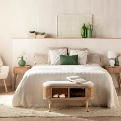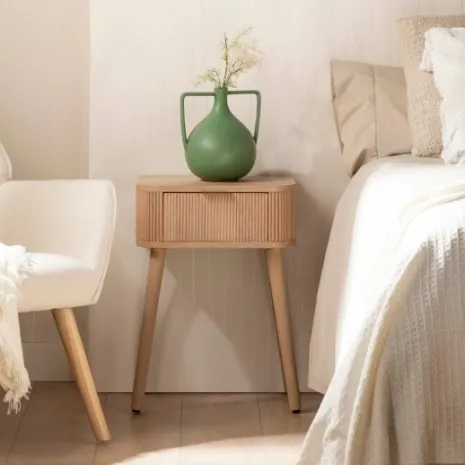 Transforma tu dormitorio en un espacio cálido y acogedor con la mesita de noche Mina, elaborada en chapa de pino y madera de roble. Cuenta con un amplio cajón en el que podrás guardar todos aquellos objetos que no quieres tener a la vista.