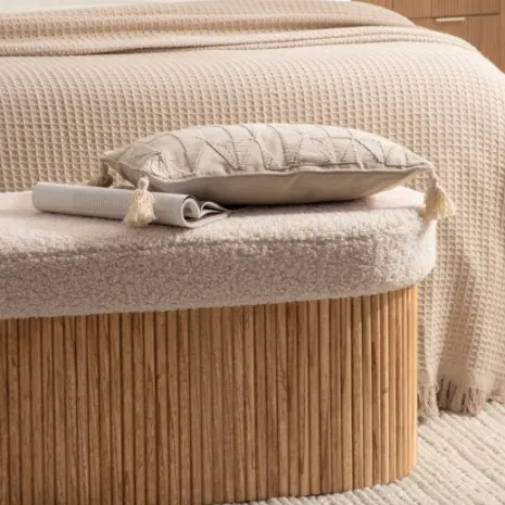 El banco Naira, elaborado en madera de paulownia y tapizado con suave borreguito blanco, fusiona funcionalidad y estilo de manera excepcional. Su práctico compartimento de almacenamiento es perfecto para mantener organizados objetos como mantas o cojines. Ideal para el dormitorio, el salón o el recibidor, este banco añade calidez y elegancia, destacándose por su diseño compacto y versátil.
