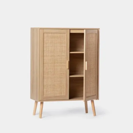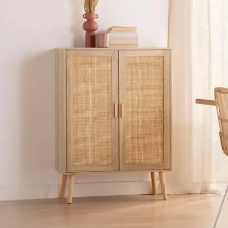 La vitrina en ratán natural Tahiti aportará un toque acogedor a tu recibidor, dormitorio o salón. Cuenta con dos puertas y tres estantes en los que podrás organizar tu vajilla, documentos o incluso ropa de hogar. Combínalo con el resto de muebles de la colección y ¡consigue un efecto wow!