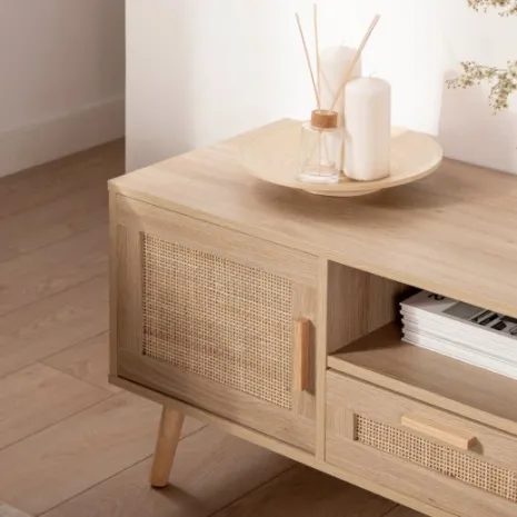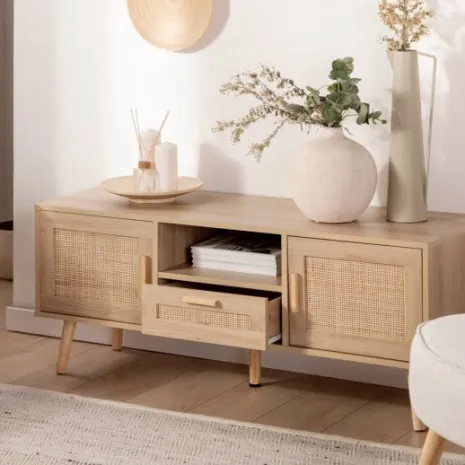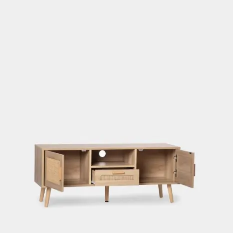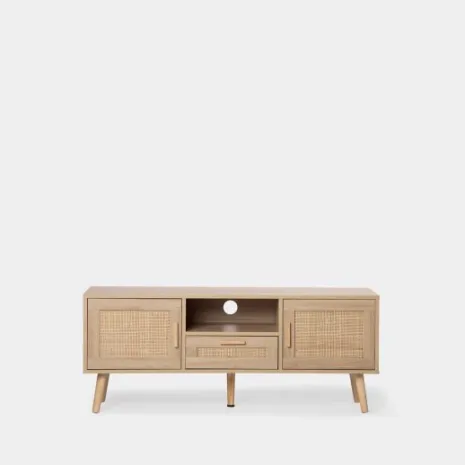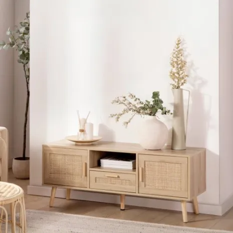 Con el mueble TV de 120 en ratán natural Tahiti conseguirás darle un toque natural y vintage a tu salón/comedor. Cuenta con dos puertas, un cajón y un estante en el que podrás almacenar todos tus accesorios multimedia y mantener el orden en tu hogar. Combínalo con los muebles de la misma colección y crea espacios con encanto.