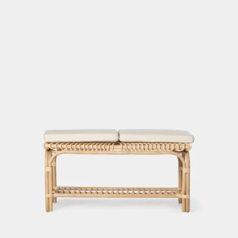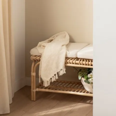 El banco en ratán natural Kina aporta frescura y calidez a cualquier estancia. Se puede usar como pie de cama o como banqueta en la zona de la entrada. Incluye dos cojines desenfundables que aportan un extra de comodidad. Está fabricado a mano con ratán natural, por lo que puede presentar irregularidades propias de su elaboración y ligeras variaciones en la tonalidad respecto al color que se muestra en la imagen.