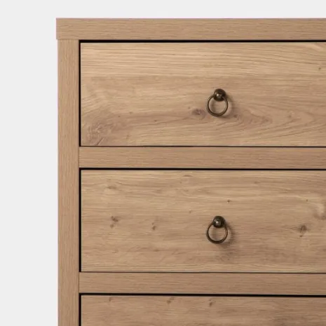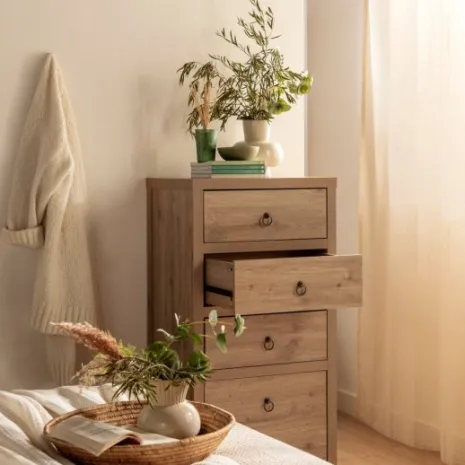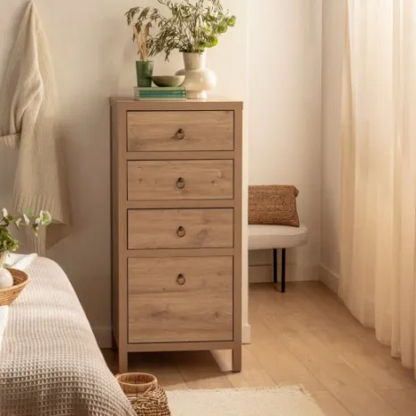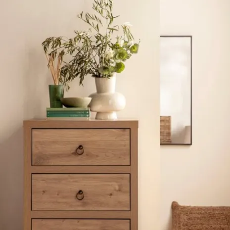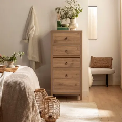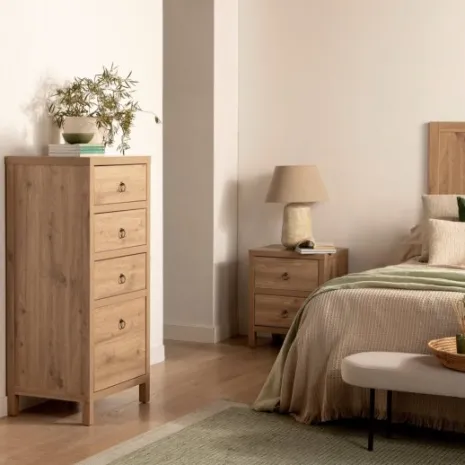 La cajonera en madera color natural Livorno es ideal para mantener tu dormitorio ordenado. Con su amplia capacidad de almacenamiento, maximiza el espacio disponible. Combínalo con otros muebles de la misma colección y crea un ambiente encantador y armonioso en tu hogar.