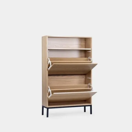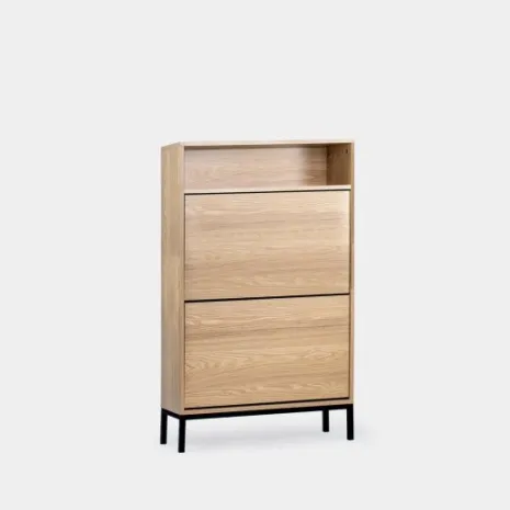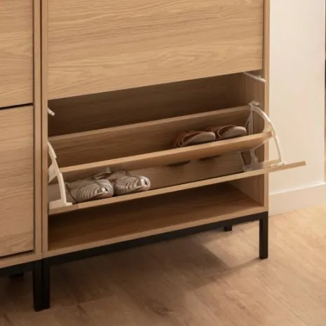 Organiza tus zapatos con estilo con el zapatero en madera color natural Remi. Sus dos puertas abatibles ofrecen una solución práctica y elegante para almacenar de forma organizada y práctica hasta 12 pares de zapatos. Además, cuenta con un separador extraíble, lo que te permite adaptar el espacio para guardar calzado de mayor volumen con facilidad. Para garantizar su estabilidad y seguridad, es imprescindible fijarlo a la pared.
