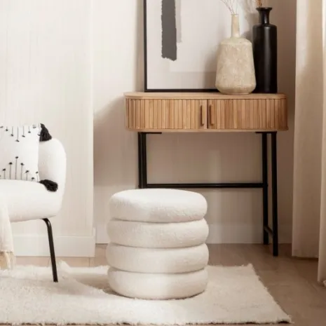 Crea un ambiente acogedor en tu hogar con el puf redondo Roma tapizado en borreguito blanco, un tejido que proporciona sensación de suavidad y calidez. Además, cuenta con práctico espacio de almacenaje en su interior, perfecto para guardar mantas, cojines y otros objetos que desees tener a mano pero fuera de la vista. Con Roma, disfruta de comodidad y funcionalidad en un diseño actual.