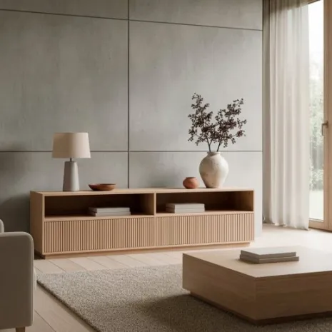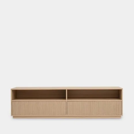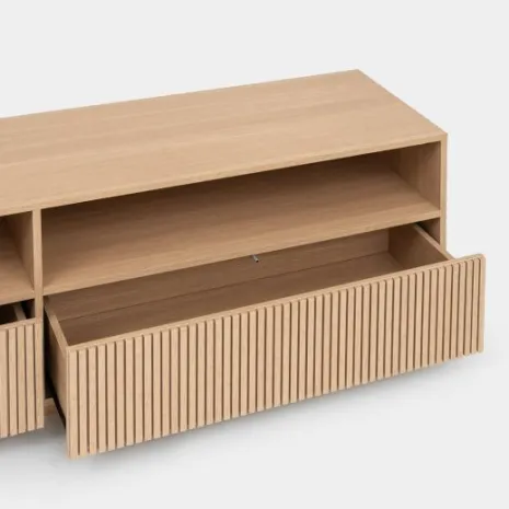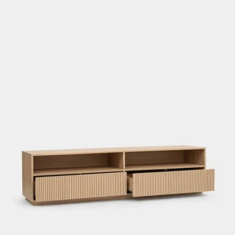 Transforma tu salón con el mueble TV 180 Saven en acabado natural. Es la pieza perfecta si buscas un diseño distintivo, acogedor y elegante. Combina dos amplios cajones y dos huecos abiertos superiores que ofrecen un gran espacio de almacenamiento para mantener tus accesorios y dispositivos multimedia de forma ordenada y accesible. Descubre el resto de la colección Saven y consigue un ambiente lleno de estilo en tu hogar.