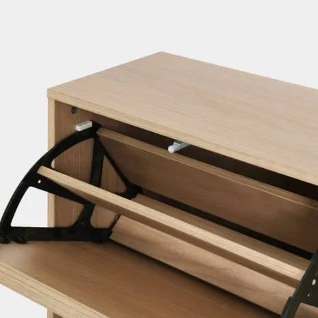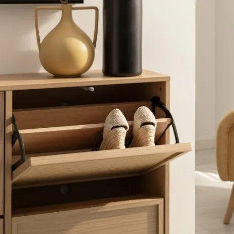 El zapatero doble Bora, confeccionado en madera color natural y fibra natural, es la opción perfecta para aquellos que buscan una solución de almacenamiento de calzado amplia y elegante. Su diseño robusto y estilizado cuenta con cuatro puertas abatibles, ofreciendo un amplio espacio para organizar hasta 24 pares de zapatos. Cada compartimento incluye separadores ajustables y extraíbles, lo que permite guardar tanto zapatos de tamaño estándar como calzado de mayor volumen. Completa tu hogar con los demás muebles de la colección Bora y crea un ambiente armonioso y lleno de estilo. Para garantizar su estabilidad y seguridad, es imprescindible fijarlo a la pared.