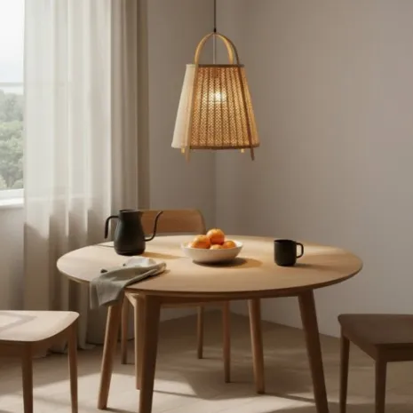 La lámpara de techo Koma de estilo natural cuenta con un diseño sencillo y ligero que te encantará. El bambú y el lino son dos materiales muy utilizados en la decoración, ya que aportan sensación de frescura. Es ideal para comedores, salones y dormitorios. No incluye bombilla.
