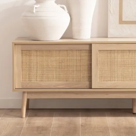 Dale un toque de calidez y estilo a tu hogar con el mueble TV 180 Ikigai, que fusiona la serenidad del diseño escandinavo con la elegancia del minimalismo japonés. Acabado en madera y ratán natural, ofrece un estilo cálido y orgánico que transforma cualquier salón. Su sistema de puertas correderas permite optimizar el espacio y mantener ordenados todos los dispositivos y accesorios. Combínalo con otros muebles de la colección para lograr un look completo y atemporal.