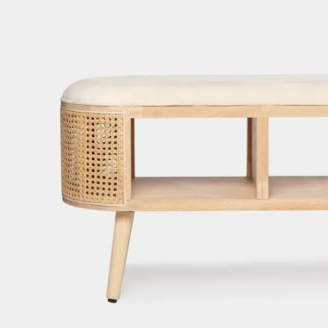 Embellece tu hogar con el banco Chela, tapizado en terciopelo beige y con detalles en ratán natural. Esta combinación aporta calidez a cualquier ambiente. Versátil y elegante, es ideal como pie de cama o asiento adicional en tu sala de estar. Además, cuenta con dos huecos centrales para almacenar zapatos, teniéndolos siempre a mano.