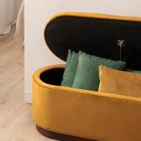 El banco Isola, tapizado en suave terciopelo mostaza, combina estilo y funcionalidad de manera excepcional. Su diseño elegante y acogedor no solo brinda confort, sino que también añade un aire de frescura a cualquier ambiente. Con un práctico compartimento de almacenamiento, es perfecto para mantener organizados mantas, cojines y otros objetos. Ideal para el salón, el dormitorio o el recibidor, el banco Isola se presenta como una pieza versátil y encantadora que realza la decoración de tu hogar.