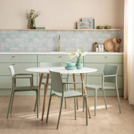 La mesa de comedor redonda Lyss es de estilo nórdico y minimalista. Se convierte en la elección segura si eres un apasionado del diseño escandinavo y tienes un espacio reducido.Con sobre blanco y patas en acabado natural, esta mesa se convierte en la protagonista de tu salón comedor. Es muy acogedora y se convierte en la mesa ideal para espacios reducidos.Es apta para 6 comensales por lo que podrás vivirla y compartila con familiares y amigos en estancias como la cocina, el comedor o incluso convertila en mesa de reuniones en oficina. También es la elección perfecta para hostelería.