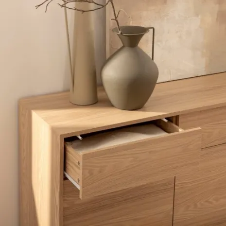 Añade elegancia y funcionalidad a tu salón con el aparador en madera color natural Remi. Sus tres puertas y tres cajones ofrecen amplio espacio de almacenamiento ideal para guardar vajilla, cristalería y otros objetos que desees mantener organizados y protegidos del polvo. Combínalo con otros muebles de la colección para lograr un look completo y armonioso en tu hogar.