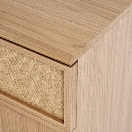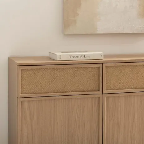 Agrega un toque de funcionalidad y estilo a tu hogar con el aparador Bora, elaborado en madera color natural y fibra natural. Este versátil mueble cuenta con tres amplios cajones y tres puertas, proporcionando un generoso espacio de almacenamiento para la vajilla, cubiertos y otros menajes del hogar. Completa la decoración de tu hogar con otros muebles de la colección Bora y logra un ambiente armonioso y lleno de estilo.