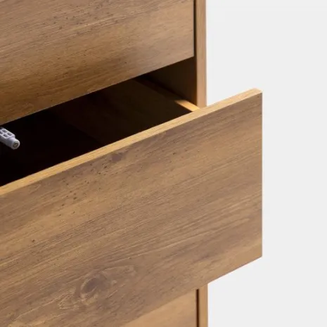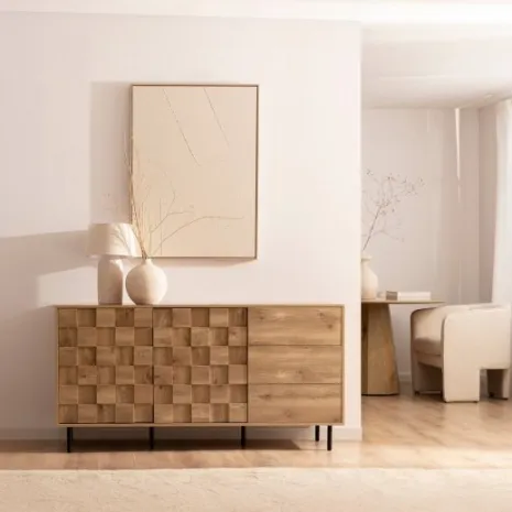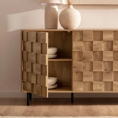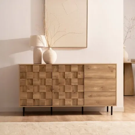 Potencia tu salón con el aparador Ivar, que combina un acabado en madera natural con estilizadas patas metálicas. Su distintivo detalle texturizado crea un impacto visual único, aportando profundidad y carácter mientras ofrece generoso espacio de almacenamiento ideal para organizar vajilla, cristalería y otros objetos de forma práctica y ordenada. Cuenta con dos puertas y tres cajones que proporcionan versatilidad y funcionalidad perfecta para mantener protegidos todos tus objetos esenciales. Descubre el resto de la colección Ivar y crea un ambiente sofisticado y moderno para tu hogar.