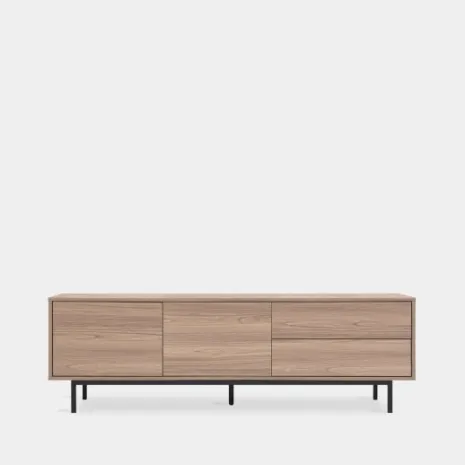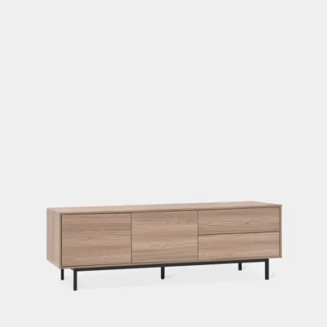 Eleva el estilo de tu salón con el mueble TV 160 en madera color natural Elton. Sus compartimentos cerrados permiten ocultar y almacenar todos los aparatos electrónicos necesarios para tu TV. Es ideal para conseguir un ambiente cálido y elegante en tu estancia.