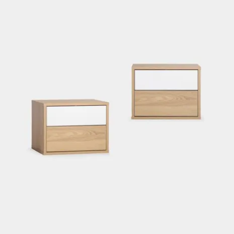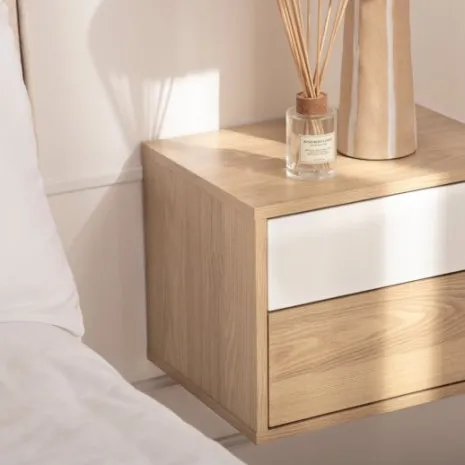 ¡Aprovéchate de este pack de 2 mesitas! La mesita de noche flotante Kayne combina funcionalidad y estilo en una pieza única. Acabada en madera natural y blanco, crea un contraste elegante que aporta personalidad a tu dormitorio. Sus dos cajones ofrecen espacio de almacenamiento práctico y discreto para tus objetos personales, mientras que su diseño flotante optimiza el espacio y aporta sensación de amplitud. Una solución perfecta si buscas un estilo contemporáneo y funcional para tu hogar.