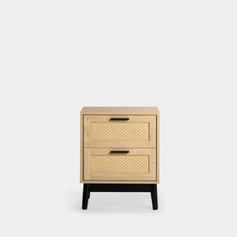 Transforma tu dormitorio en un espacio acogedor y con estilo con la mesita de noche Samoa en madera color natural y fibra natural. Con dos amplios cajones, esta pieza ofrece un generoso espacio de almacenamiento para ropa, accesorios y objetos personales. Ideal para quienes buscan una pieza versátil y atemporal que complemente la decoración de su hogar.